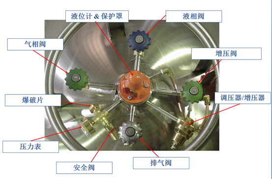 然后加入液氮后測重,一立升液氮重為0.8公斤加上空罐的重量得出滿罐時(shí)的重量,減去使用過后現(xiàn)有秤重,就是應(yīng)補(bǔ)充的的容量。可以用專用的液位尺測液位,另一種簡便的方法是找一根干凈的木棒插入液氮內(nèi)數(shù)秒鐘,將木棒迅速取出暴露在空氣中,插入液氮的部份因溫度低而結(jié)成白霜,很易容檢測罐內(nèi)液氮的存量。